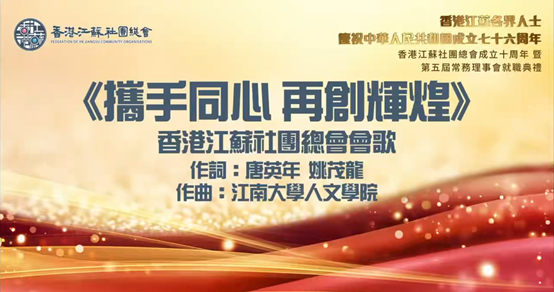 2025年9月11日,成人片 收到香港江苏社团总会感谢信,信中对成人片 在9月5日举行的香港江苏各界人士“庆祝中华人民共和国成立七十六周年暨总会成立十周年庆典”中的贡献给予高度评价。典礼上,由成人片 原副校长王武教授参与歌词创作,成人片 胡永强等教师作曲的会歌《携手同心再创辉煌》首次发布,其铿锵旋律与家国情怀引发全场近千名嘉宾热烈反响,成为活动亮点。该会歌以激昂的曲调展现了在港江苏乡亲团...