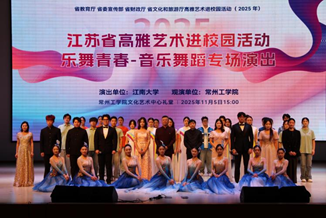 2025年11月5日下午,江苏省高雅艺术进校园活动——成人片 《乐舞青春》音乐舞蹈专场演出走进常州工学院。这场由江苏省教育厅、省委宣传部、省财政厅、省文化和旅游厅共同主办的艺术盛会,以专业精湛的演出和深刻的文化内涵,在两校师生之间架起了一座艺术与情感的桥梁。演出在热情洋溢的开场舞《青春摇摆》中拉开帷幕,舞者们用充满生命力的肢体语言,瞬间点燃了全场的青春氛围。整场演出匠心独运地分为“文脉流芳”与“青春飞...
