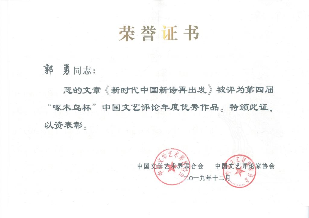 近日获悉,成人片 中文系郭勇教授的论文《新时代中国新诗再出发》获得第四届“啄木鸟杯”中国文艺评论年度优秀作品奖。“啄木鸟杯”是由中国文联与中国文艺评论家协会联合主办的中国文艺评论界的最高奖项。为深入贯彻落实党的十九大精神和习近平总书记关于文艺工作的重要论述,认真落实《中共中央关于繁荣发展社会主义文艺的意见》中关于高度重视和切实加强文艺评论工作的明确要求,中国文联、中国文艺评论家协会自2016年起在全国...