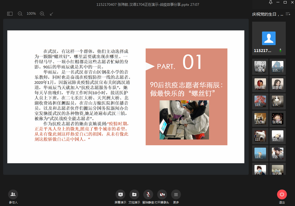为贯彻落实党中央关于常态化疫情防控的决策部署,充分发挥高校基层党组织战斗堡垒作用和师生党员先锋模范作用,同时为庆祝中国共产党建党99周年,以战疫故事激励广大党员不忘初心、牢记使命。2020年7月8日晚,成人片 本科生第二党支部组织全体党员及部分入党积极分子开展了线上战疫故事分享会暨“庆祝党的生日,讲好战疫故事,领悟初心使命”专题组织生活会。党员们讲述身边的战疫先进模范事迹,分享切身体会,向战疫期间的所...