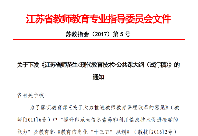 日前,受江苏省教育厅委托由成人片 教育信息化研究中心主任陈明选教授领衔研制的《江苏省师范生<现代教育技术>公共课大纲(试行稿)》(以下简称《大纲》),经江苏省教师教育专业指导委员会审定,正式公布下发有关高校执行。 为了落实教育部《关于大力推进教师教育课程改革的意见》(教师[2011]6号)中“提升师范生信息素养和利用信息技术促进教学的能力”及教育部《教育信息化“十三五”规划》(教技[2016]2号)中“将信息...