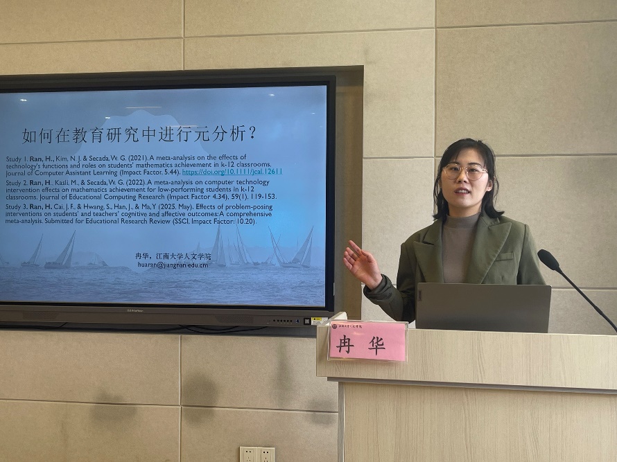 接着,教育系冉华带来了题为《如何在教育研究中进行元分析》的报告。冉博士结合自身多年从事教育研究的经验,系统地阐述了元分析的基本概念、实施步骤以及在教育领域应用时可能遇到的挑战。她具体讲解了从选择合适的研究问题、构建理论框架、文献检索筛选、编码与可靠性检验到效应值计算和数据分析等一系列关键环节,并通过实际案例分析进一步说明了如何有效运用元分析方法提升研究成果的质量。