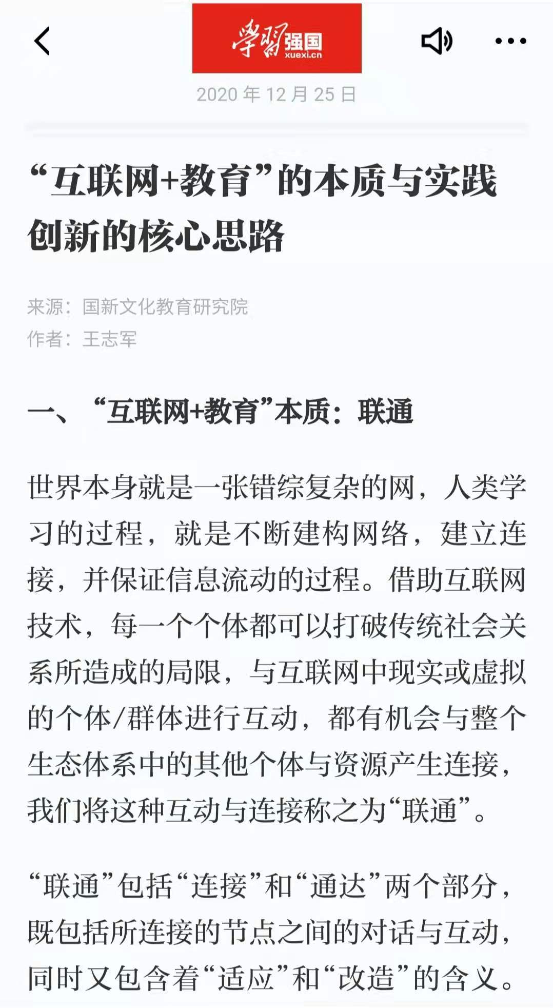 教育技术系王志军副教授应“国新文化教育研究院”的邀请,在《学习强国》平台上发表《“互联网+教育”的本质和实践创新核心思路》一文。
