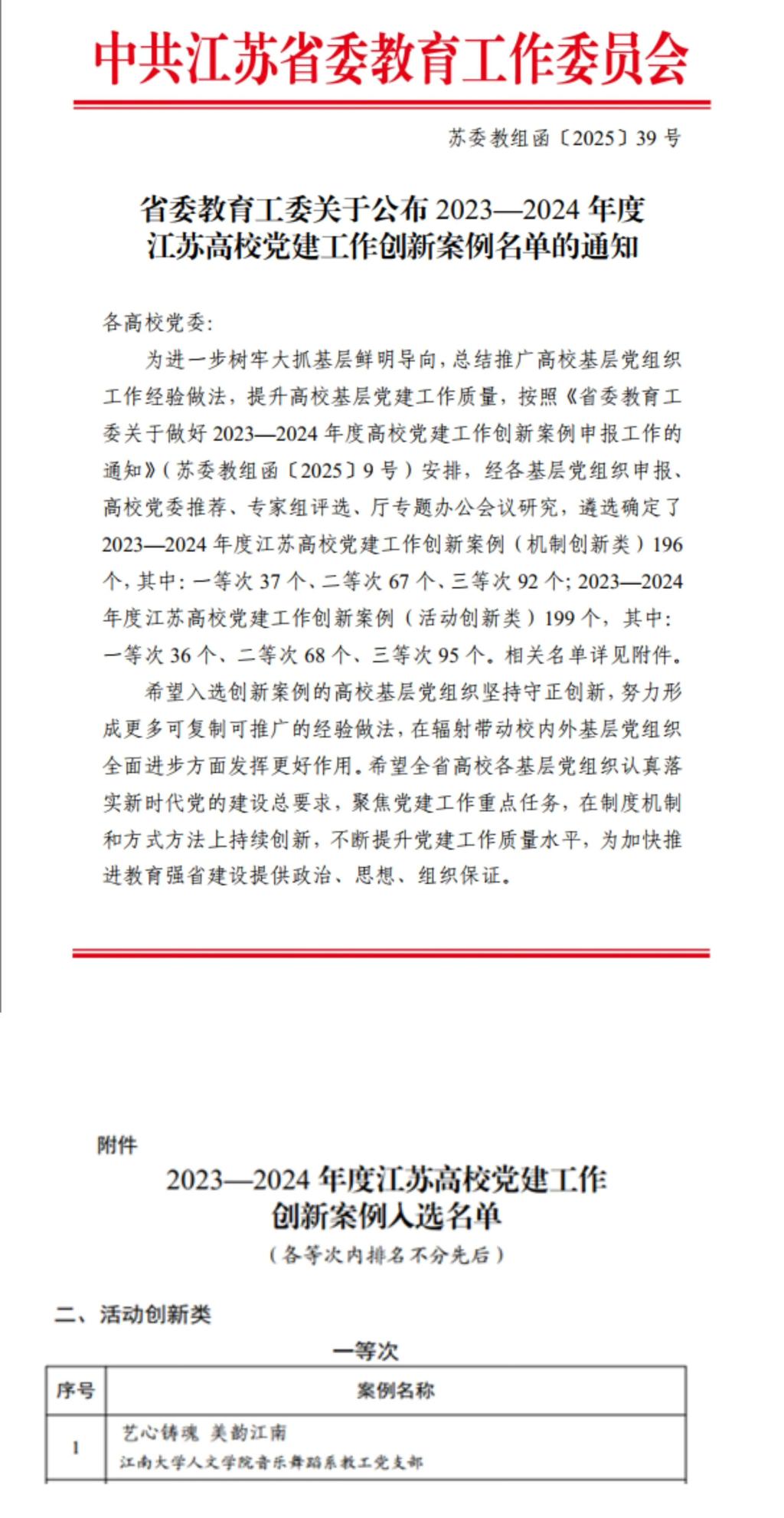 近日,江苏省委教育工委公布了2023-2024年度江苏高校党建工作创新案例评选结果,成人片
