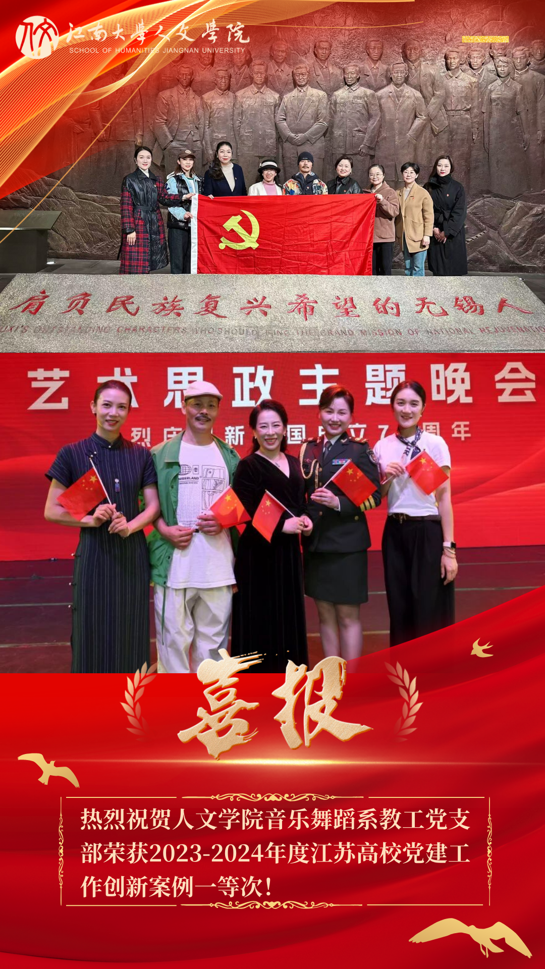紧扣新时代美育要求,着力打造“党建+美育”工作品牌。音乐舞蹈系教工党支部将支部建设与艺术实践结合,通过舞台创作展演、江南文化传承、通识课堂浸润、跨界文化出圈等多元形式,开展《艺心铸魂•美韵江南》主题党日活动,贯通“价值引领-艺术实践-文化传播”全链条,形成党建引领美育提质、美育赋能党建增效的双向融合新范式,系统构建了具有江南特色的美育育人体系。