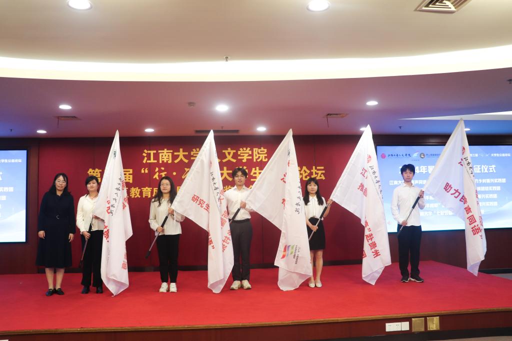 2024年暑期支教团出征仪式,李萍为心手相牵推普助力乡村振兴实践团、童声同语推普助力民族团结实践团、七彩公益社区教育实践团等5支团队授旗。