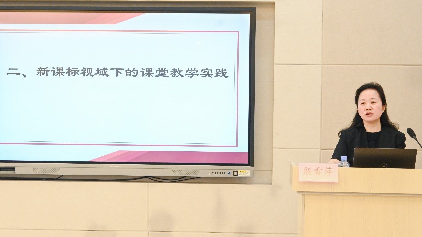 殷校长还阐述了新课标视域下的课堂教学实践,一是要关注目标上的整合,二是要开发利用课程资源,三是要关注跨学科融合。她详细展示了语文学科中一个单元的整体教学以及一个具体的综合性学习模块,加深了同学们对如何在实际课堂中实施新课标理念的理解。