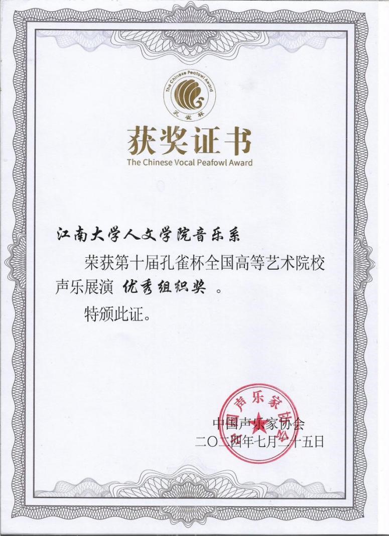 音乐系获得“优秀组织奖”,指导教师钱琳、张璇获“优秀指导教师奖”。
