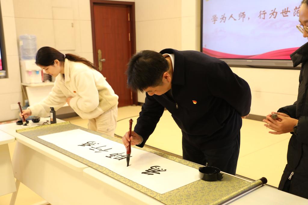 倪松涛充分肯定了团日活动的精准选题,表示本次主题团日活动不仅有新意,更有意义,随后为支部同学讲授思想政治课。他强调,建设教育强国,是全面建成社会主义现代化强国的战略先导,而教育家精神则是建设教育强国的精神动力和信念支撑。他从“不懈追求、双向提升、持续创新”三个方面展开,指出在教育强国的背景下,作为师范生应深入学习“教育家精神”,不断淬炼师范生技能,坚守教育初心,提升师德情操,修炼大觉悟、大道德、大学识和大作为,掌握最新教育技术与手段,主动追求成为高素质专业化的“大先生”,努力成长为“政治强、情怀深、思维新、视野广、自律严、人格正”的“让党和人民都满意的好老师”。授课结束后,倪松涛与支部同学共同书写“学为人师,行为世范”,既体现了校领导对同学们的殷殷期盼,又表达了支部同学共同的教育心声。