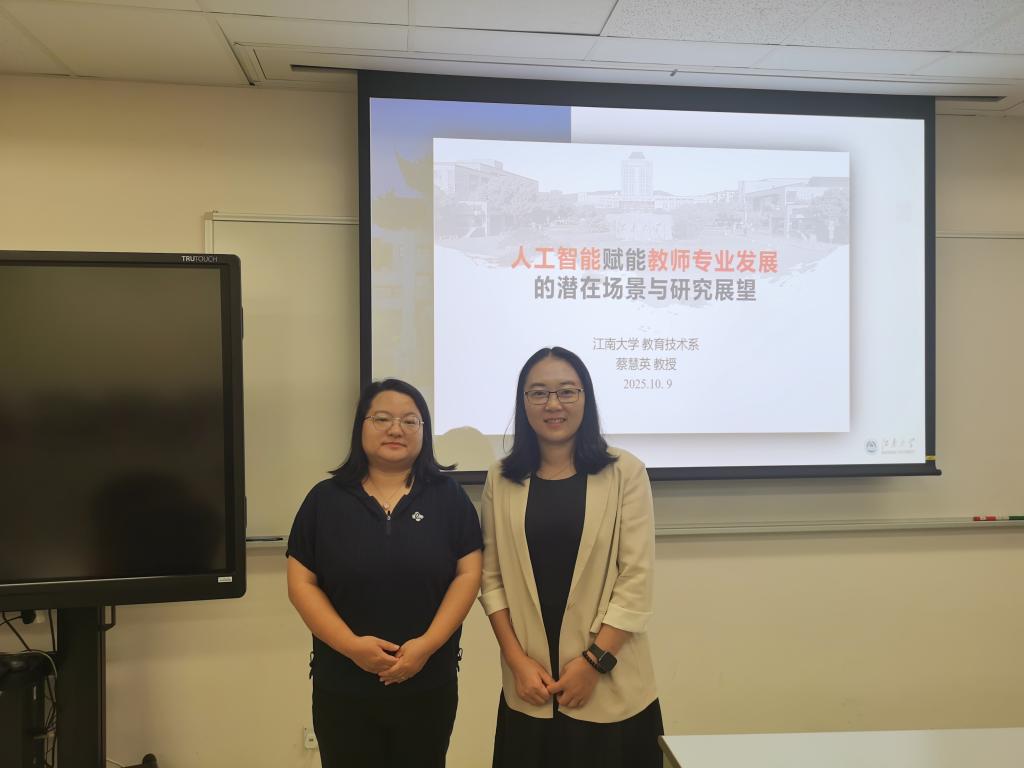 访学期间,蔡慧英为香港教育大学师生做了两场学习报告。在《STEM教育中面向协作问题解决的学习分析方法与实践》的报告中,蔡慧英首先剖析了协作问题解决在STEM教育中的重要意义,随后系统梳理了该领域中学习分析方法的发展历程、研究现状与未来趋势。在《人工智能赋能教师专业发展的潜在场景与研究展望》报告中,蔡慧英在简要回顾教师专业发展脉络的基础上,重点阐述了人工智能赋能教师专业发展的四类典型应用场景,进而对未来研究方向进行了展望。两场报告均吸引了众多师生参与,引发热烈讨论,获得广泛好评。