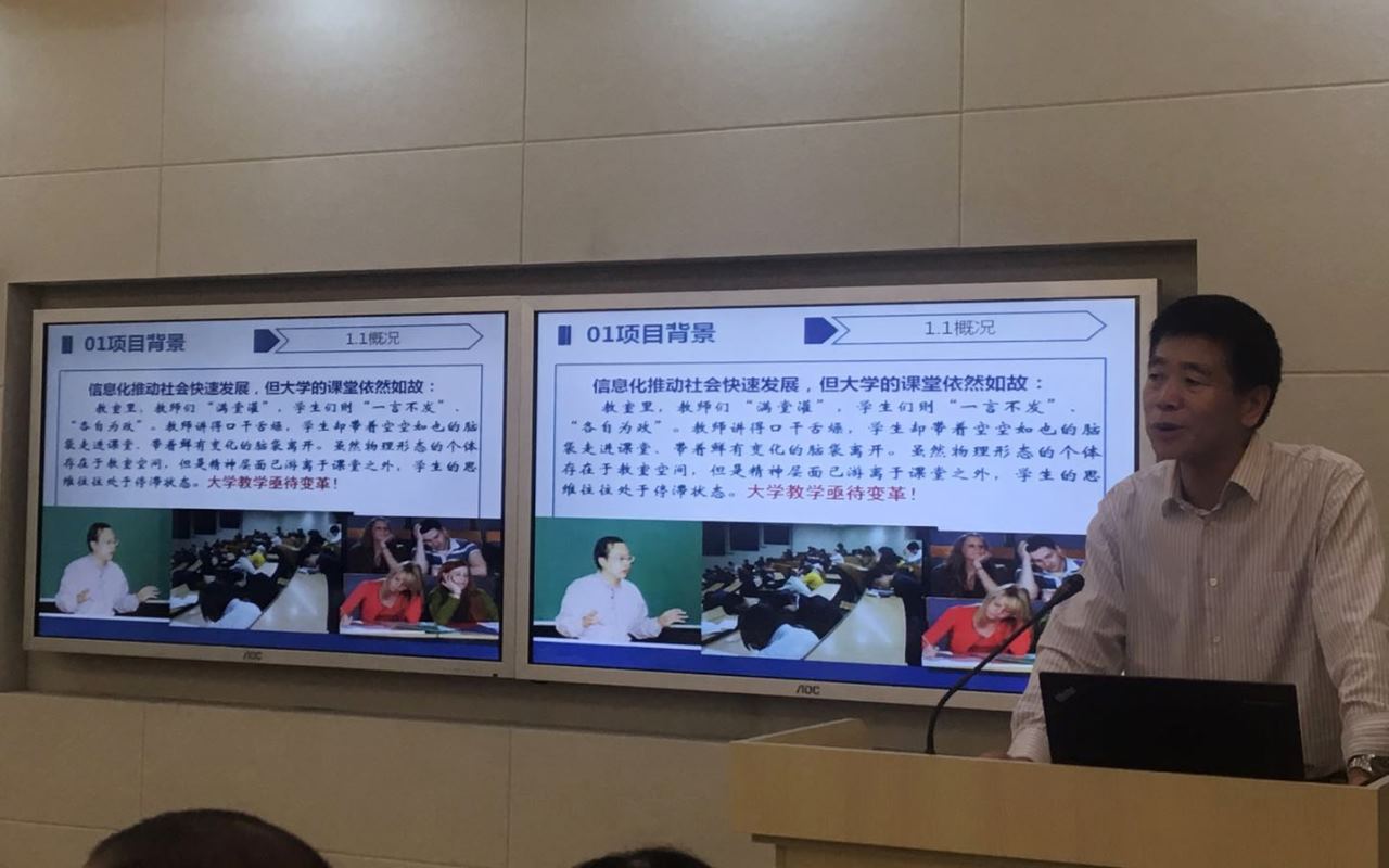 课题负责人陈明选教授首先从项目背景、项目研究问题与目标、项目成果和实践案例等方面对课题的实施情况进行汇报,项目经过两年实施,取得了四方面研究成果与应用成效:(1)构建了着重理解的混合式教学改革理论体系,探索了“翻转课堂”、“着重理解的多元评价”等教学设计方法,发表了系列教学改革论文;(2)结合教改试点专业-成人片