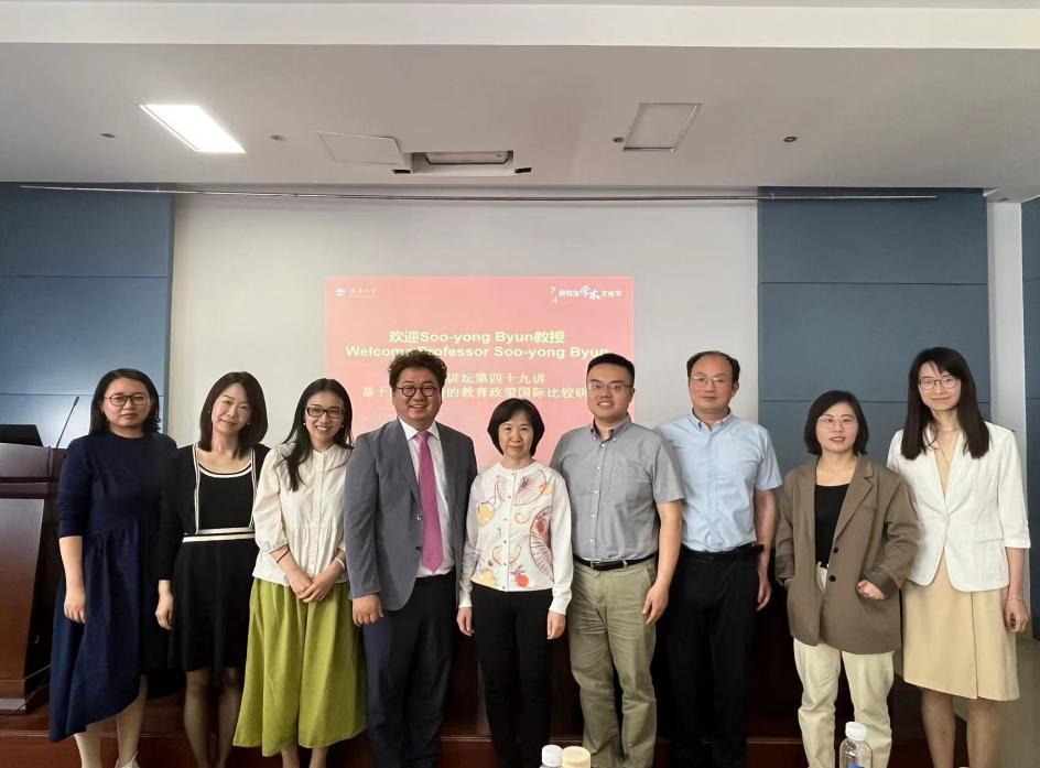 2024年5月17日上午,由成人片 研究生院主办、成人片 承办的江南讲坛第四十九讲在田家炳楼209报告厅顺利举行,讲座邀请到宾夕法尼亚大学教育理论与政策、人口学与亚洲研究的联席教授,梨花女子大学教育学系客座教授Soo-yong Byun,他的报告题目为“基于跨国数据的教育政策国际比较研究”。本场讲座由成人片 院长助理屈廖健主持,成人片 党委书记姚剑英、教育系党支部书记王文礼及成人片 、外国语学院相关研究领域的教师及研究生参加了讲座。