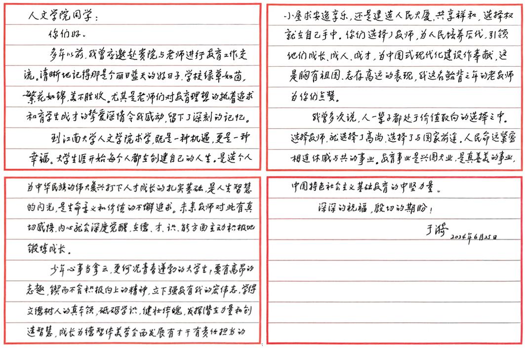 同学的信。古色古香的信笺,端庄隽秀的字迹,书信流露出于漪老师赤诚的教育情怀和对青年学生的殷殷嘱托。