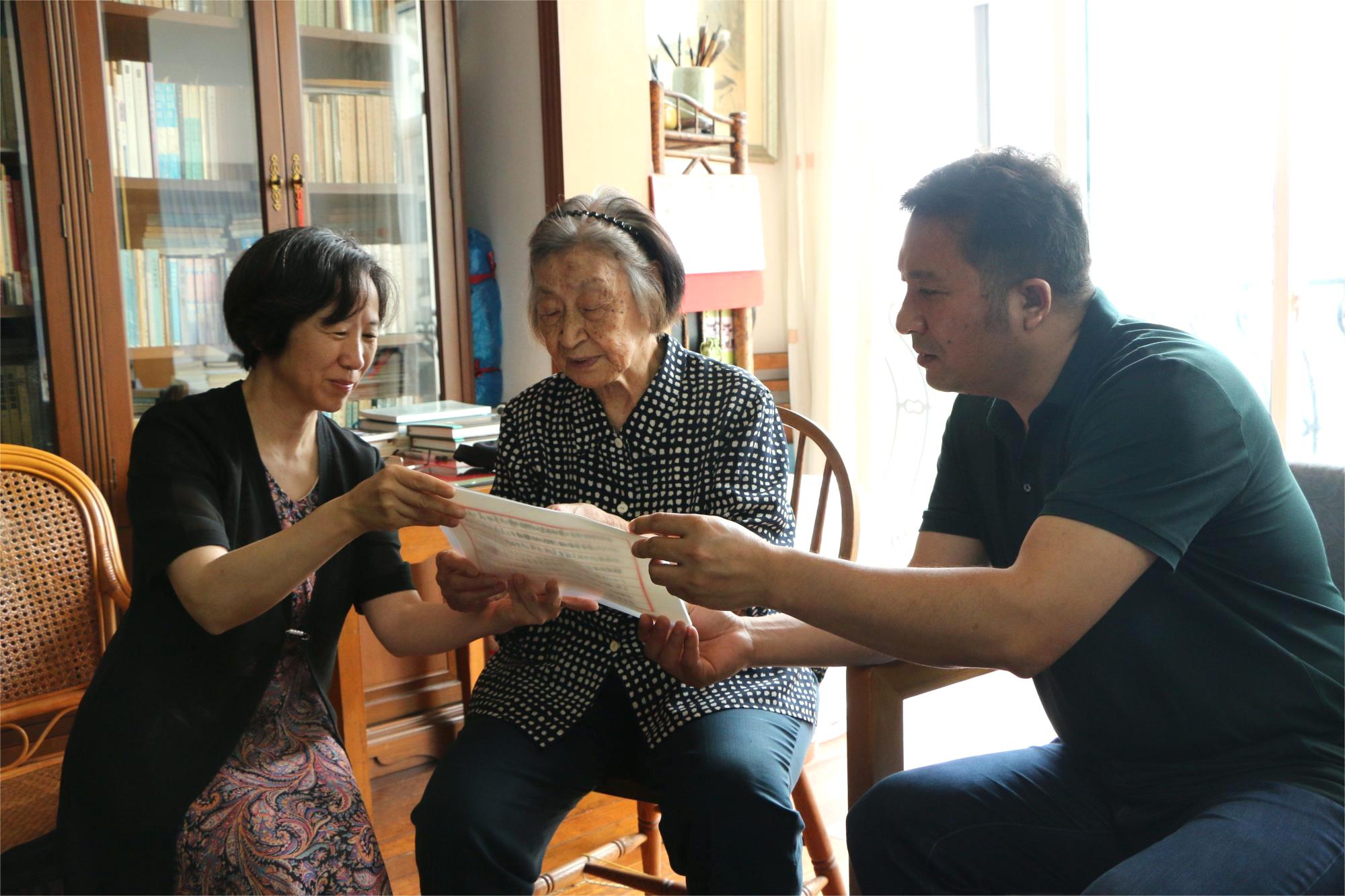 于漪老师从教70多年,长期躬耕于中学语文教育,退休之后依然为教育奔忙,虽已95岁高龄,但仍精神矍铄。她看到江苏的家乡人来访非常高兴,表示对家乡有着深厚的感情。“选择教师,就选择了高尚,选择了与国家前途、人民命运紧密相连休戚与共的事业……,同学们要有高昂的志趣,锲而不舍积极向上的精神,立下强教有我的宏伟志,学得立德树人的真本领,砥砺学识,健壮体魄,发挥潜在力量和创造智慧,成长为德智体美劳全面发展有才干、有责任担当的中国特色社会主义基础教育的中坚力量。深深的祝福,殷切的期盼”在书香浓郁的客厅里,于漪老师面带微笑、饱含深情地读着自己写给成人片
