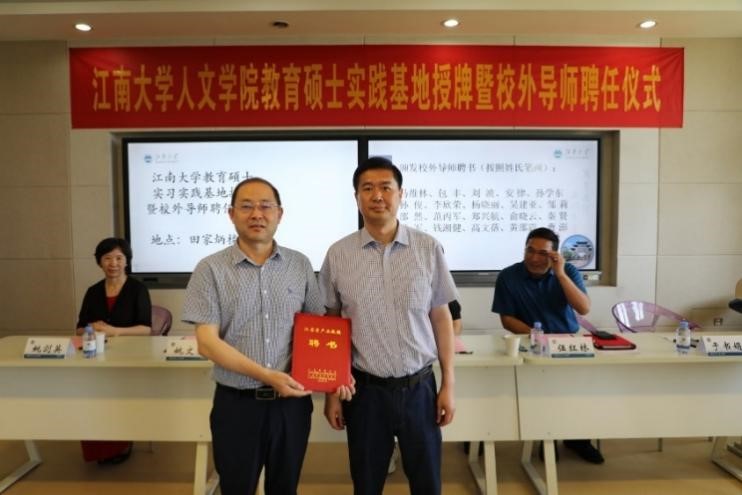 教育硕士12所实习实践基地,分别是江苏省天一中学、江苏省锡山高级中学、江苏省南菁高级中学、无锡市第一中学、无锡市江南中学、无锡市东林中学、江苏省锡山高级中学实验学校、无锡市太湖格致中学、江苏省无锡师范附属小学、无锡市连元街小学、无锡市东林小学、江苏省无锡崇宁路实验小学,萧晶、姚文生、姚剑英、伍红林、佟柠为12个基地学校进行了授牌,之后为第二批次的21位教育硕士校外导师颁发了聘书。