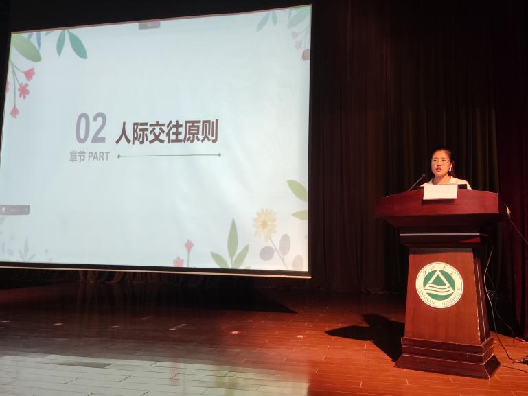 心理健康文化节“超有趣宿舍大会”系列活动的快闪视频开启本次讲座,展示了上半年以宿舍为单位的心理健康教育趣味活动,极大调动了宿舍长的积极性。接着,她从宿舍人际交往入手,列举了几种常见的宿舍矛盾,强调宿舍长在宿舍和谐关系的构建中起到“小家长”作用。随后,她从人际交往原则、人际沟通技巧、心理调节方法等方面进行分享,结合案例讲解常见的心理问题识别与判断方法,澄清心理健康和心理咨询概念,并重点介绍了学校的心理服务资源,消除同学们对心理问题的误解,引导宿舍长积极关注和关心宿舍同学的情绪和状态,力所能及帮助宿舍同学,遇到困难主动与老师交流反馈,共同营造温暖温馨的宿舍文化氛围。