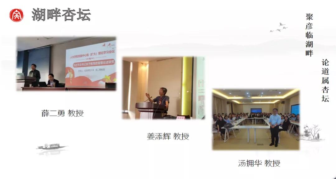 在活动开展方面,人文研会注重发挥思想引领作用,立足人文学术,彰显人文色彩,配合举办青年学者系列讲座、“教学技能大赛”、“研本交流会”等活动。与兄弟学院共同举办的“青衿江南•后浪青春”七院联谊晚会、“相聚沿路•温暖金秋”研究生八院联谊活动等丰富的文体活动彰显了研究生们昂扬的青春活力。第十五届“湖畔杏坛”顺利举办了10场研究生论坛,8场学者论坛,先后邀请了薛二勇、姜添辉、汤拥华等专家学者前来交流,提高了成人片