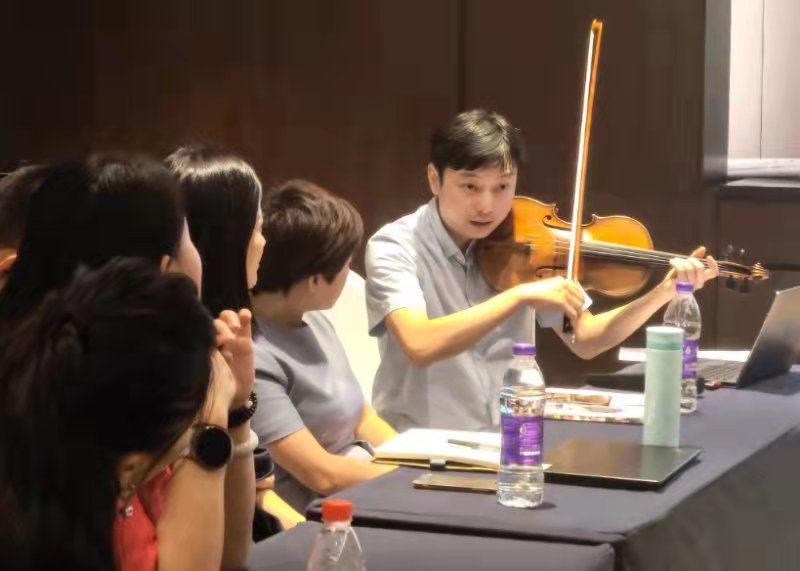 江博老师以“奇妙的古典音乐”为主题,从西方古典音乐的起源到中西方音乐文化碰撞思考,演奏与讲解相结合,让在场老师深入感受了音乐的和谐之美。