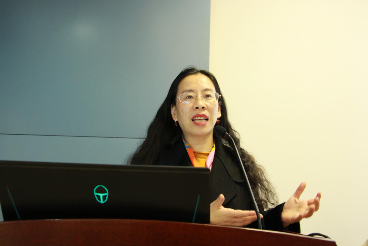副院长王芳老师讲话。她围绕作者钱铁民先生的科研情况和治学精神对大家做了介绍。她讲到,钱老师在专业领域造诣颇深,《缥缈孤鸿影——阿炳研究文集》是钱老师多年研究成果的集成之作,整合了其数十年来与阿炳有关的亲身经历,不仅深具学理性,而且对有关阿炳的一些颇有争议的问题做出了回答。此外,王老师指出,任何一项学术研究的完成都需要经历一个相当长的过程,它需要不断地采集资料,逐一求证事实,在此基础上再进行整合、思考、分析。王芳老师希望参会的同学们能够学习钱铁民先生专一、精思的治学精神,特别是成人片