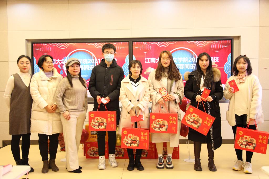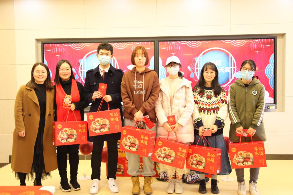 “恭喜发财”的BGM欢快入耳,老师们分三轮抽取了“牛气冲天”、“牛年大吉“和”好运多多“三个奖项。被抽中的同学们被其他同学热情拥抱,狂吸欧气。中奖的同学们略显”凡尔赛“的抱怨三只松鼠巨型礼包、干果大礼包和百草味干果大礼包实在有些沉重,同时也挂着胜者的灿烂笑容感谢学院送来这丰厚的礼物和其中热烈而深沉的爱。