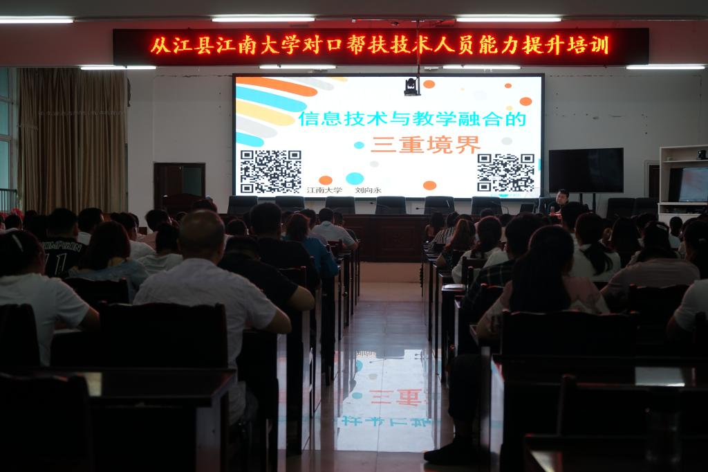 教育系徐兆洋副教授、教育技术系刘向永副教授分别为全体学员作了专题培训,拉开了从江扶贫培训项目序幕。从江县成人片