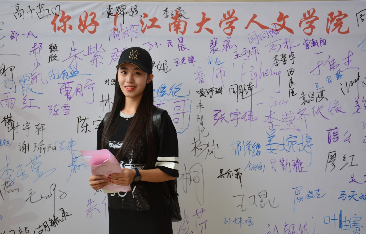 新生在签名墙前留影