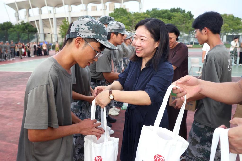 在板报评比和歌咏比赛中取得的优异成绩给予高度评价,对全体带训教官的辛勤付出表示感谢。她勉励同学们以军训为新起点,潜心钻研专业知识,发扬集体精神,团结协作,将坚韧意志和奋斗精神融入大学生活的每一步。