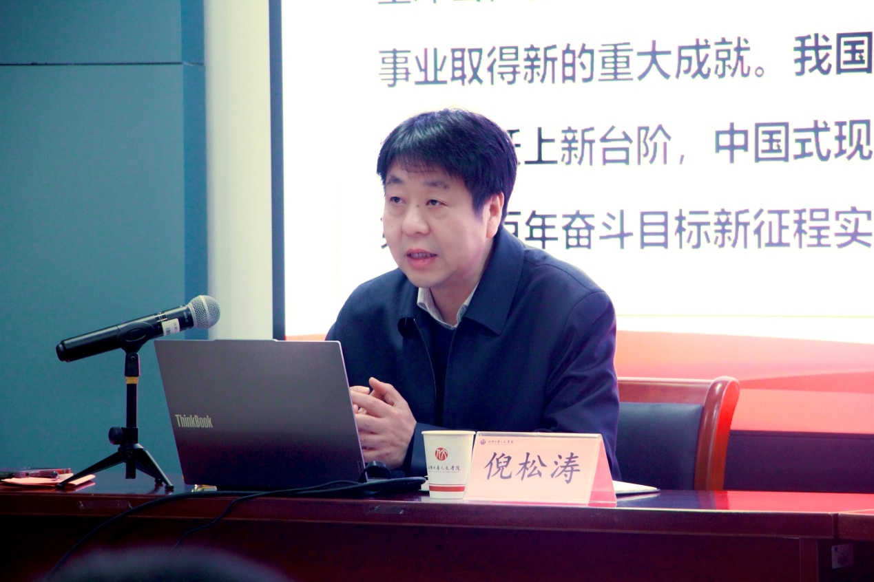 为深入学习贯彻党的二十届四中全会精神,引导广大师生准确把握全会核心要义,深刻认识新时代高校的使命担当,12月10日,校党委副书记倪松涛深入人文学院,以《擘画新蓝图,奋进新征程——学习贯彻党的二十届四中全会精神》为主题,为学院师生讲授了一堂深刻而生动的专题宣讲。教技系教工党支部全体党员、汉师2203、小教2304团支部全体学生、学院师生代表等参加本次学习。活动由成人片